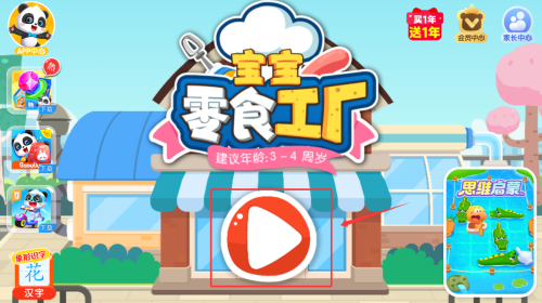 1、點擊主界面紅框標注的紅色播放按鈕,啟動寶寶零食工廠啟蒙游戲。