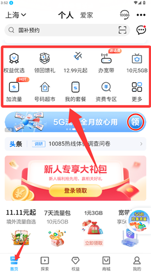 2、返回應用首頁,在功能區域點選權益優選服務入口。