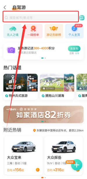 4、自駕游板塊支持輸入城市名稱或景點關鍵詞,快速檢索相關路線與目的地信息。