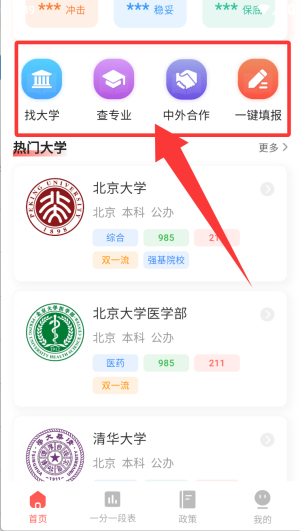 結合學生分數推薦沖刺、穩妥,保底等不同梯度院校,計算分析高校歷年錄取,提供各校優勢學科、歷年招生數據、高校碩博點等情況。院校對比、大學排行、優勢學科專業一看便知,大學就業率、深造率、考研率、創業率一應俱全幫你快速選擇心儀大學
