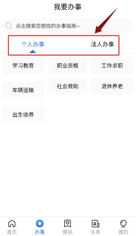 2、在辦事界面可選擇個人事務辦理或法人業務辦理兩種模式。